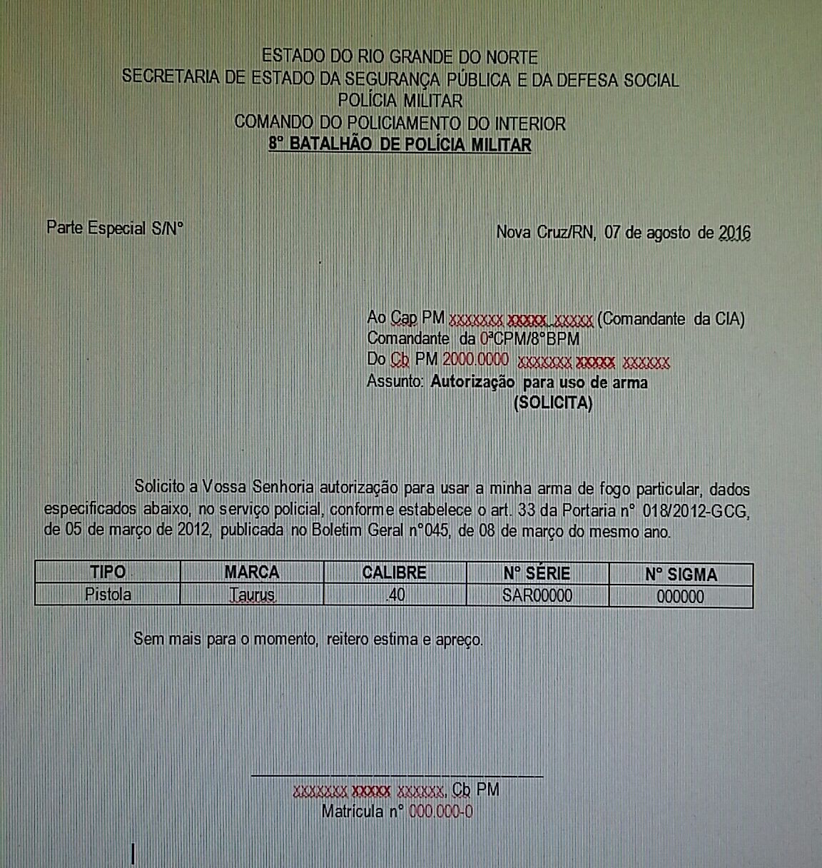 Usar sua arma pessoal para o serviço na PMRN é possível. A decisão é sua. Entretanto, nos termos da Portaria 018/2012-GCG, publicada no BG n¤ 045, de 08 de Março de 2012, o policial deve estar autorizado, a fim de evitar alguns problemas. A solicitação deve ser realizada mediante parte especial.