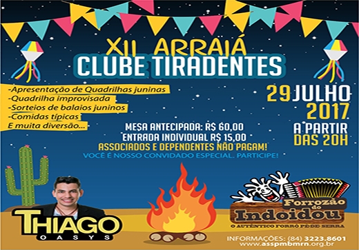 ASSPMBMRN promove o 12º Arraiá do Clube Tiradentes neste sábado, 29 Ainda no clima dos festejos julinos, a ASSPMBMRN realiza o 12° Arraiá do Clube Tiradentes neste próx…