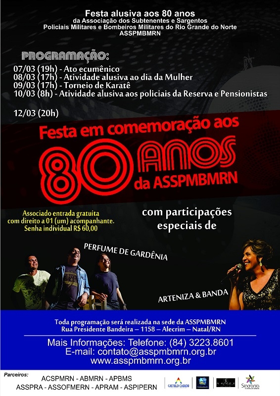 Comemorações pelos 80 anos da ASSPMBMRN iniciam hoje Os 80 anos da Associação dos Subtenentes e Sargentos Policias e Bombeiros Militares do Rio Grande do…