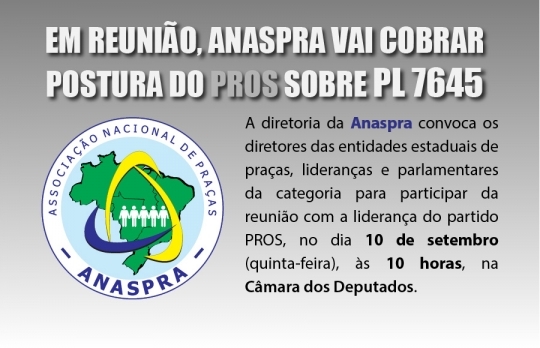 Em reunião, Anaspra vai cobrar postura do PROS sobre PL 7645 A diretoria da Anaspra convoca todos os diretores das entidades estaduais de praças, lideranças e p…